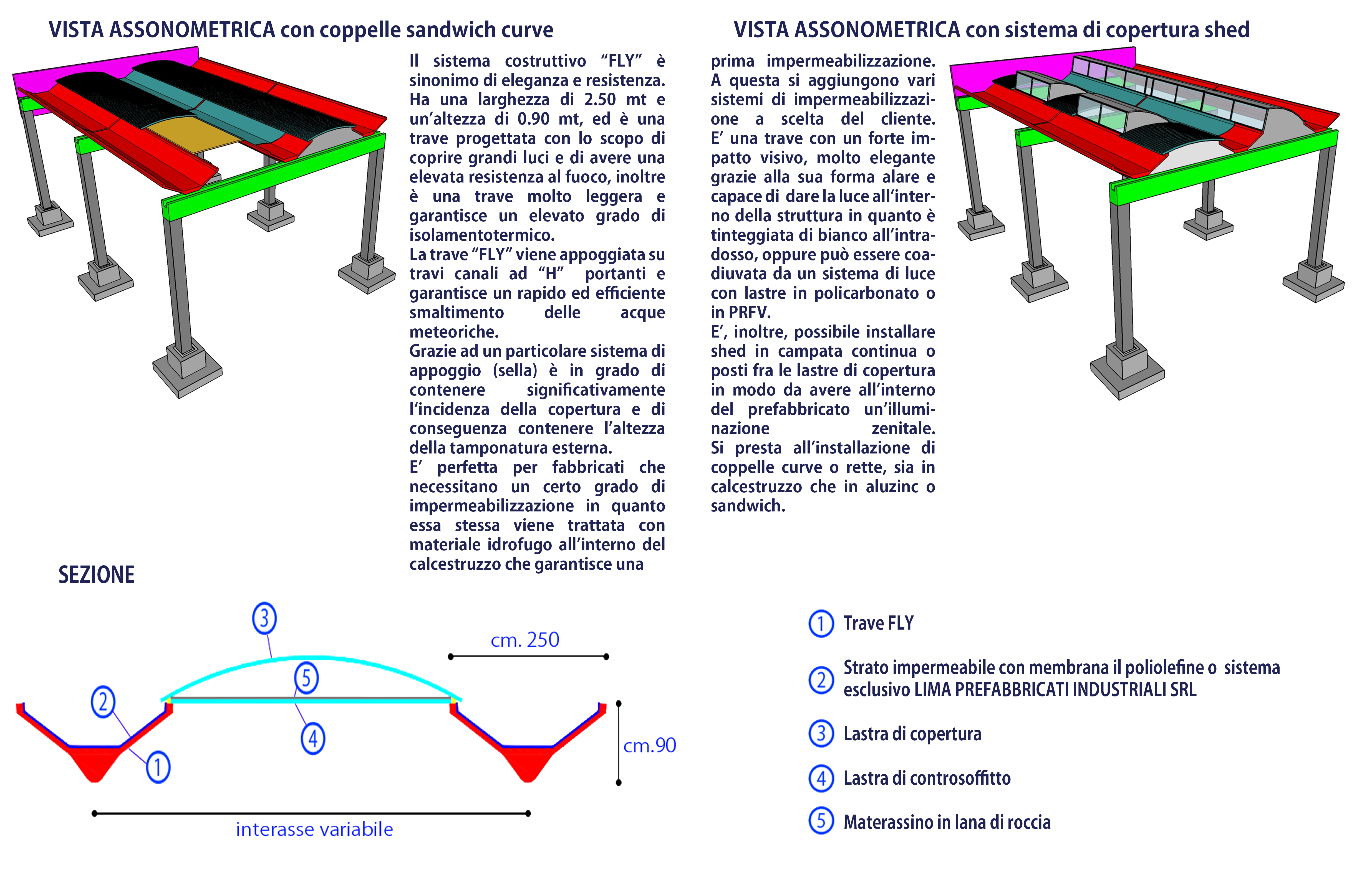 Il sistema costruttivo “FLY” é sinonimo di eleganza e resistenza. Ha una larghezza di 2.50 mt e un’altezza di 0.90 mt, ed è una trave progettata con lo scopo di coprire grandi luci e di avere una elevata resistenza al fuoco, inoltre é una trave molto leggera e garantisce un elevato grado di isolamento termico. La trave “FLY” viene appoggiata su travi canali ad “H” portanti e garantisce un rapido ed efficiente smaltimento delle acque meteoriche.Grazie ad un particolare sistema appoggio (sella) é in grado di contenere significativamente l‘incidenza della copertura e di conseguenza contenere l'altezza della tamponatura esterna. E’ perfetta per fabbricati che necessitano un certo grado di impermeabilizzazione in quanto essa stessa viene trattata con materiale idrofugo all’interno del calcestruzzo che garantisce una prima impermeabilizzazione.A questa si aggiungono vari sistemi di impermeabilizzazione a scelta del cliente. E’ una trave con un forte impatto visivo, molto elegante grazie alla sua forma alare è capace di dare la luce all‘interno della struttura in quanto é tinteggiata di bianco all’intradosso, oppure può essere coadiuvata da un sistema di luce con lastre in policarbonato o in PRFV.E’, inoltre, possibile installare shed in campata continua o posti fra le lastre di copertura in modo da avere all’interno del prefabbricato un’illuminazione zenitale. Si presta all’installazione di coppelle curve o rette, sia in calcestruzzo che in aluzinc o sandwich.